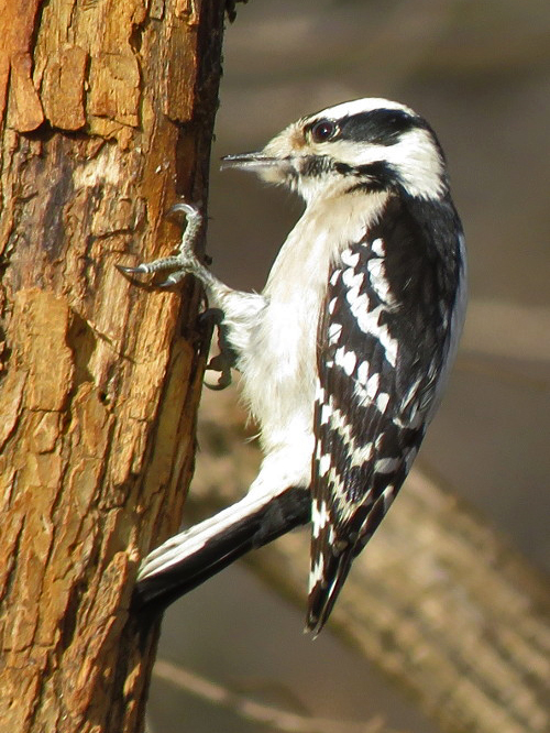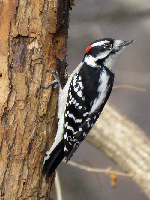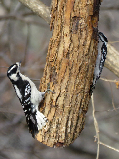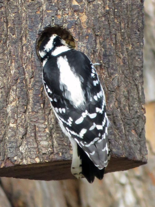 Another peekaboo. Everyone likes the log feeders. Unfortunately, starlings can raid those, which is why we have the smooth one as well.