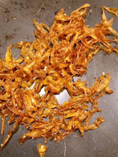 It’s better this morning, but I’m NEVER cutting up extremely hot peppers with my bare hands again. Two fingers on my right hand (knife hand) and nearly the entire top side of my left hand (pepper holding hand) felt like they were on fire last night, in spite of my washing my hands three times with dish detergent. Jesus, I can’t imagine what these things must taste like! Anyway, once they’re completely dry (didn’t want to scorch them in the oven), I’ll grind them and seal them. No wonder the trash pandas haven’t been eating the suet cake with scorpion pepper in it, and the ghosts are just as bad. Never touching these bitches bare-handed again!