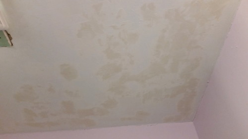 I wish I’d had just a couple more days to work on this, but at least D & T did like their “menu site” a lot. So…here’s my scabrous ceiling. I scraped off all the loose paint I could, then filled with drywall compound. It’s still wet here, which is why it looks sooooo bad.