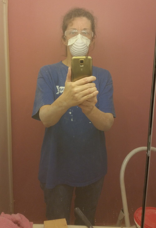 When I was sanding the ceiling and a few dings/etc. in the walls, I had the door closed for dust. Good thing…it was like Halifax harbour at 5:00 on a June morning in there. I had to tape my dust mask to my face because my breath kept fogging up my safety glasses, and working in there without safety glasses and a dust mask would have been utterly foolish.