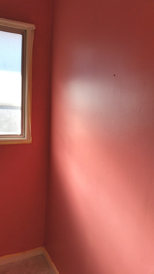 On Saturday night, I did the first wave of patching on the ceiling, and (being determined to have at least one pink wall), I put one coat on one wall. Not much, but something, and although I’d thought the colour was going to end up too dark, I was wrong. I like it!