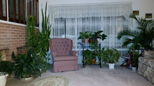 I went to water the plants last night, and they looked so bad that I did a little grooming and rearranging. I stuck Palmzilla in the corner. Barely fit, but at least it’s not out in the middle of the floor (where it left a damp spot on the carpet, so I stuck a styrofoam cooler lid under it. That tree has it in for my squishy mauve carpet!).