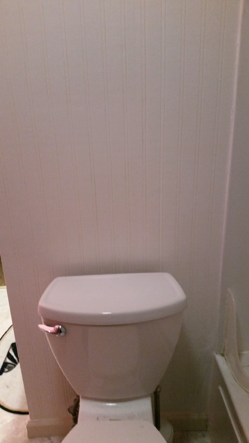 Well, the beadboard is almost finished. I didn’t clean up the bottom because it’s hard to see back there, and I was out of daylight, but I did get the seam, the top, and the sides trimed/tidied up, and sealed with paintable caulking. The seam actually came out better than I’d expected, especially considering that I somehow managed to get the damned sheet turned around when I soaked it, and instead of the perfect factory edge being on the seam, it was the one I’d cut with scissors, and I’d been none too fussy about it, either, because I’d planned to have that on the side that would be trimmed off anyway. It worked out okay, though, and the caulking gave everything a nice finish. It’s only latex, though, so I’ll definitely have to paint it. For the record, my bathroom floor isn’t filthy as it appears to be behind the toilet; that’s wallpaper paste that dripped onto the baseboard, and bits of backing paper that I scrubbed off when I cleaned the edges.