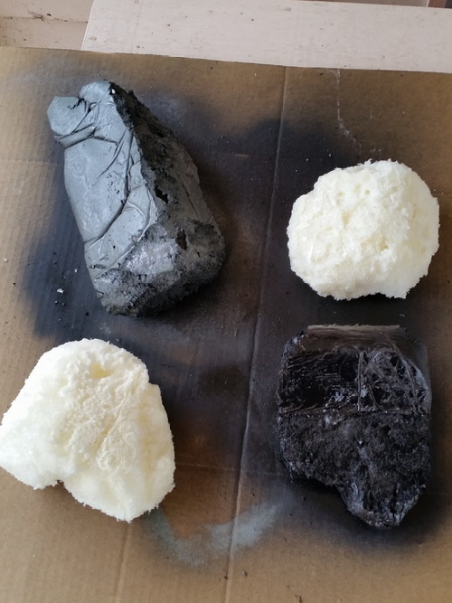 Added brown, grey and russet textured paints. I’ll sand this with 60 grit paper to remove any loose bits, then spray on a thin coat of granite textured paint, and a matte top coat. I’ll glue them to the island with black expanding foam.
