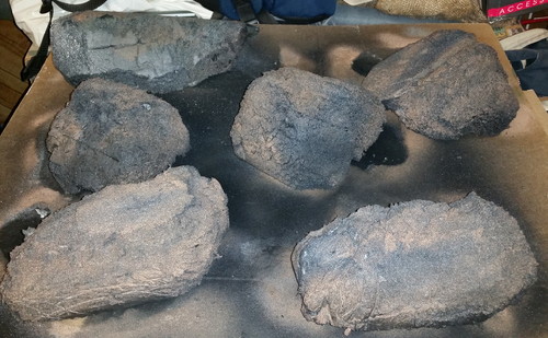 I got the textured paint a day early, so I worked on some “rocks” for the pond island. Carved with a Fat Max saw, brushed with a wire brush to shape, sprayed with a flat black base coat.