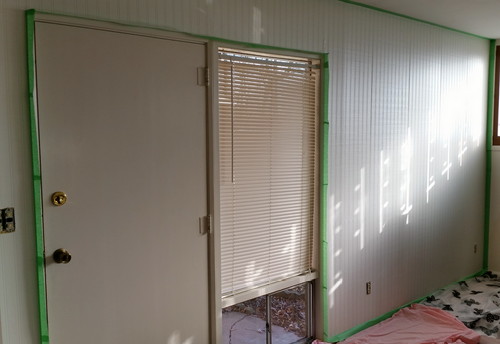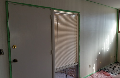 I got the wall taped off bright and early this morning; still in pyjamas until it was time to actually paint.