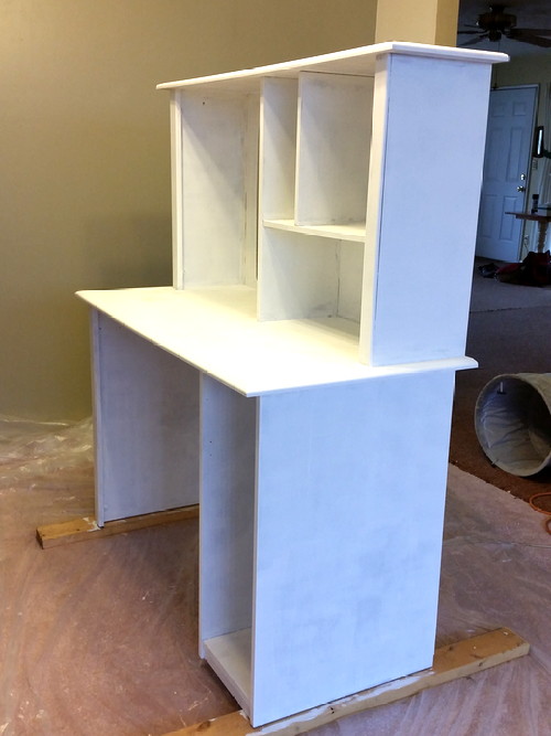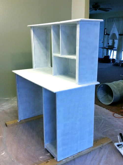 I decided upon latex paint and clear coat because I can’t move this bitch outside to paint, and it’s raining anyway. It’s not like my desk gets a lot of abuse anyway. I might regret my decision, but that’s what I’m doing.