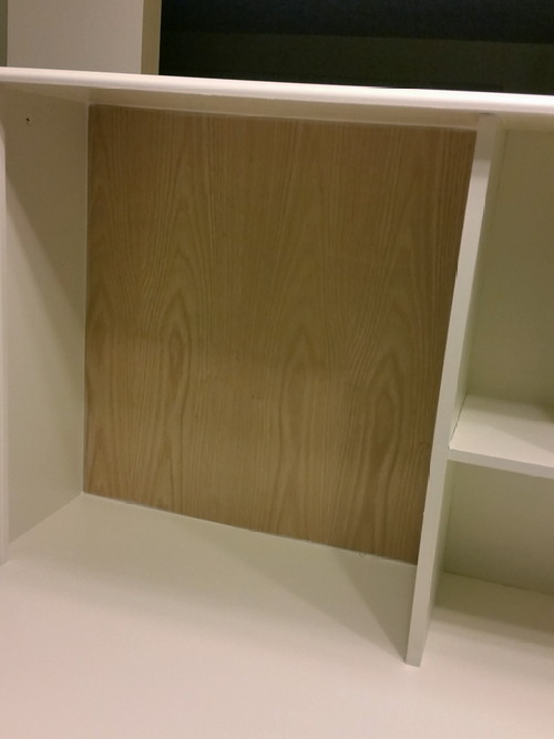 I’m sick of this thing, but I got 1/4″ plywood to cover the CRT knockout in the back. Kind of a bitch to install (nothing really solid to attach it to), and I made one small scrape in the paint (fixed it) but it’s in, and once the glue dries, I’ll put the beadboard paper on…with Gorilla Glue. Heh.