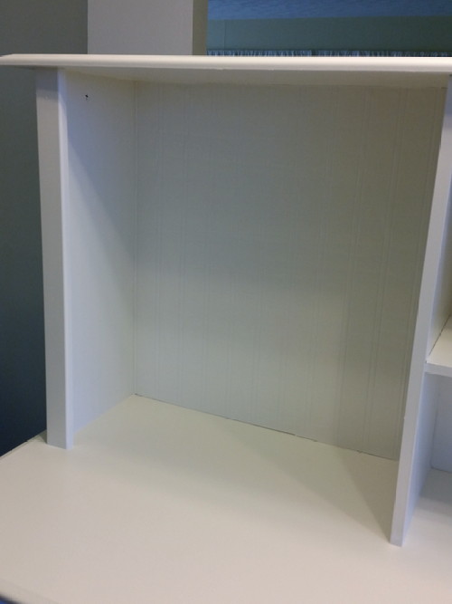 Well, kind of almost. I have the beadboard paper on. I ended up brushing white glue onto the wood and applying the paper dry. That snot paste would’ve taken ages to dry and got all over everything. I think this small piece will forgive me.