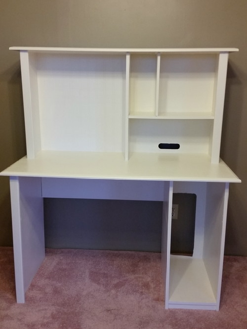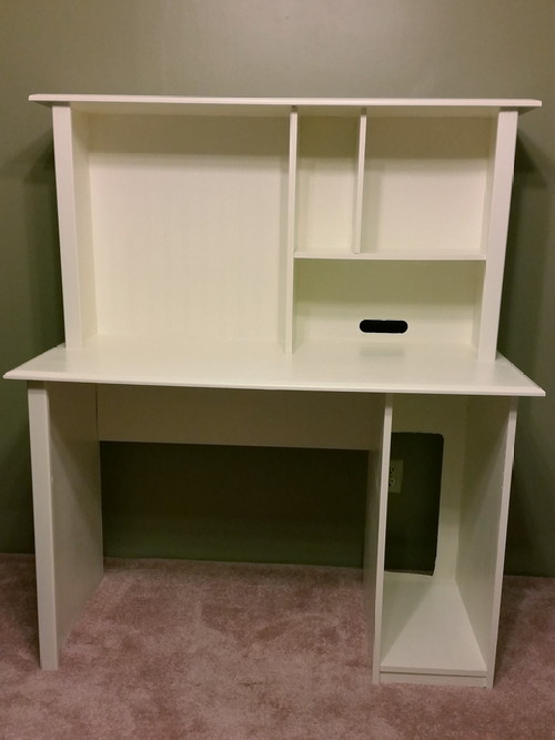 I waited a bit to let it dry some, then caulked the edges. I also caulked a few areas where there were narrow gaps that hadn’t shown when the desk was darker, but did after it was painted. I might paint it tonight; I should wait until tomorrow, but I’ll have aquarium plants to deal with then. Dunno. Anyway, I hauled it roughly into position, and once it has a door, drawer, and keyboard shelf, it’ll look the way I want. It’s not bad, even now.