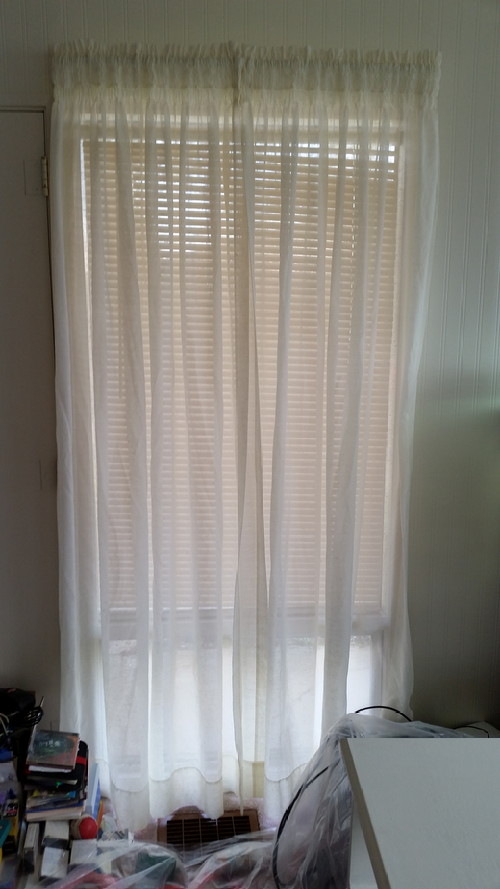 I’ve looked everywhere for the extra curtains I had from the living room because I hated the lace ones in the window by my beadboard wall, but couldn’t find them. I did find curtains that were either in the Man Cave or my closet, and I’d completely forgot I had them. Not perfect, but I’m okay with them. Better than the stupid itchy-looking lace things.