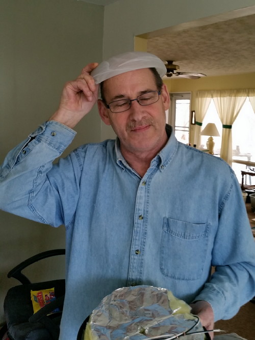 The globe for the new light, worn as a stylish hat.