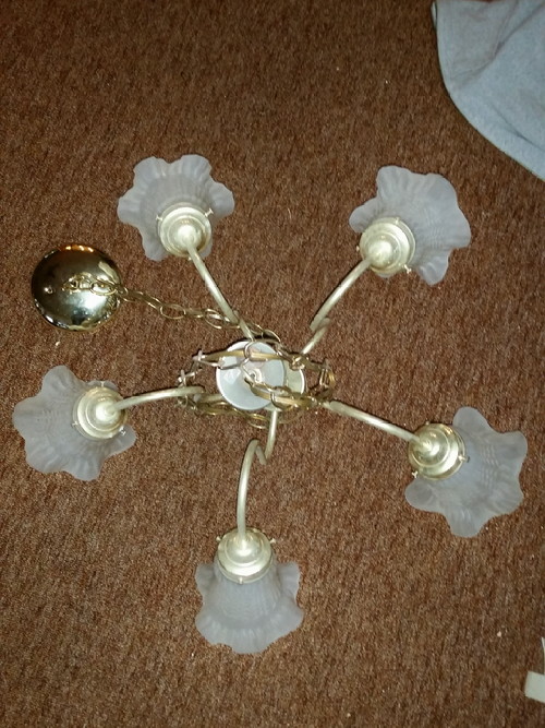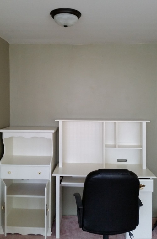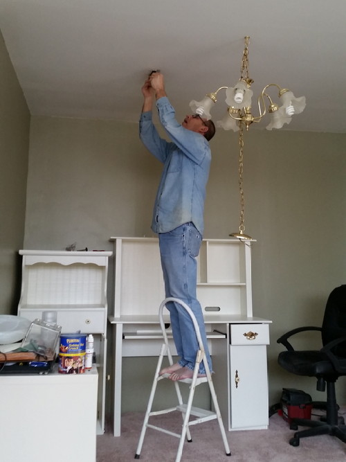 P was busy today, too, installing the new light fixture in my office. Goodbye, gaudy gold chandelier!