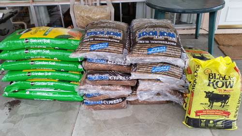 On Friday, P and M went to pick up some soil and mulch for me that will be used in the No-Mo flowerbed I’ll make soon. M had a truck, so I got lots. He not only went to get it, but stacked it neatly on the patio.