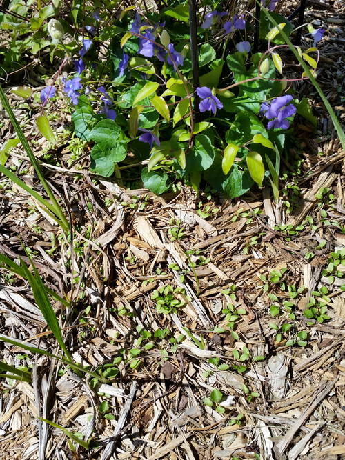 When I moved the old lady’s clematis last year, it came with a bonus violet. I left it…and I know what all those little seedlings are! Don’t care–I love wild violets.