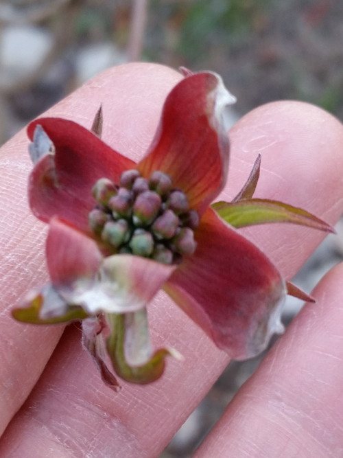 A bit damaged by the cold lately, but the first bract has appeared on the dogwood out front. I’ll take it, damaged or not!