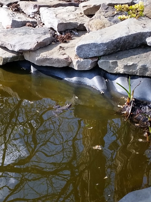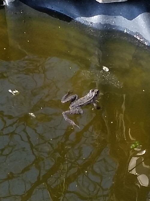 Crap photo because all I had was my phone, and he was on the other side of the pond, free-floating, and I didn’t want to scare him, but Cletus came out to grab some rays.
