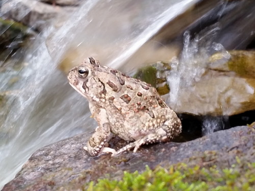 P found a toadally at work, so he brought him home; Parview is much more toad-friendly than a rail yard. I let him go near the pond, and he took a little shower to freshen up after the trip.