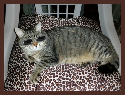 After USPS sent it to a town in MO with the same name, my solution for Bulky’s ugly plastic bag of straw arrived in the form of a leopard print nylon laundry bag. He’s fine with the change.