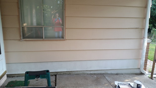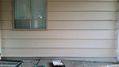 My house is no longer two colours. Well, it’s still two colours, but it’s the main colour, plus the trim colour…and OK’s “Love Story” peachy pinky beige-y that’s almost right. I put one coat of paint on after work today; hopefully, the weather will allow me to finish this week with the computer-matched final colour. For now, though, I’ll settle for 1.5 colours.