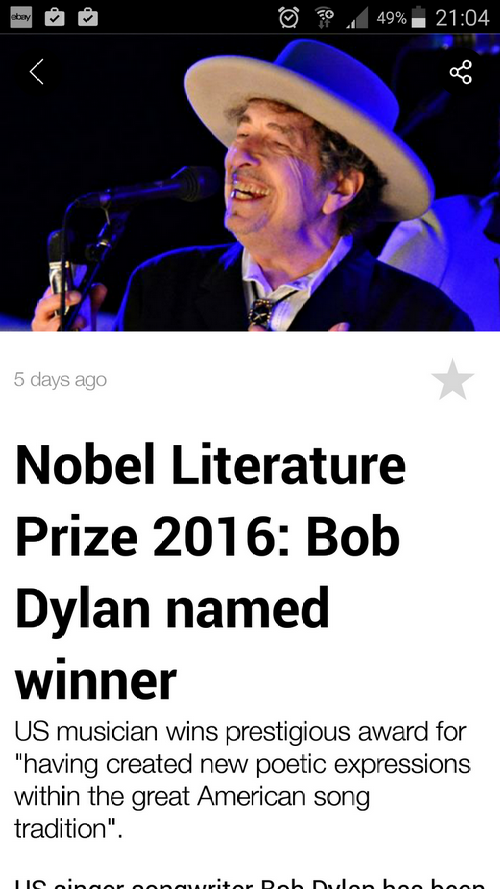 Literature? Literature? Gee, why don’t I read the news? Literature. Bob Fucking Dylan? We’ll, I suppose at least it wasn’t Niki Minaj or someone like that.
