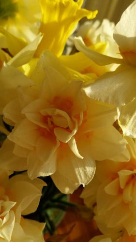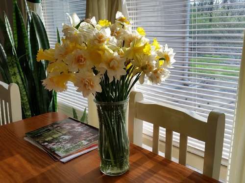 The rain kind of flattened the pretty things, plus they’re down by the creek where they aren’t really visible anyway, so I cut them and brought them inside. I had to mix in some yellow daffy-down-dillies as well; the others tend to flop a bit. Still, they look lovely on the table, and the sun came out just enough that I could get the warm colours.