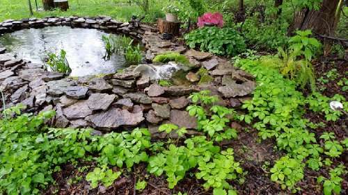 I may live to regret it, but at this point, I’m glad I put Virginia creeper around the bird pool. Hope it doesn’t choke out the pachysandra; this was just a few strings last year.