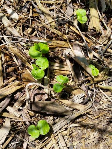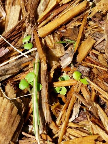 Tiny mountain mint seedlings in Thug Lyfe. The self-heal sprouted, too, but I forgot to photograph it.