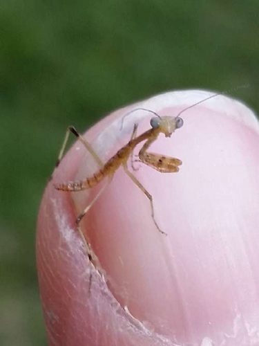 I was mixing Bloom Booster in the watering can when I noticed something moving. A small something that I initially took for a spider, but it was no arachnid; it was a tiny Carolina mantis! I knew from his size that he was a hatchling, but it wasn’t until I’d found a few more that I realized he was literally a hatchling, as in…they were still hatching! This one says, “Hello. I am a little shit, but I am cute, so you love me.”