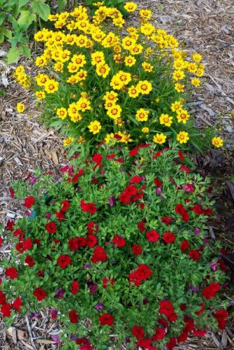 I was tired and it was hot, so I didn’t get the new shrubs in the ground on Saturday. I did, however, take a photo of calibrachoa in a pot next to Baby Sun coreopsis.