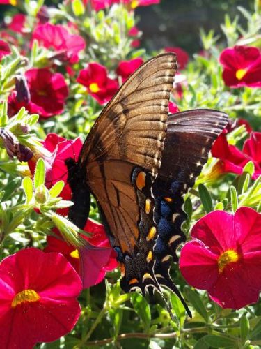 I was assisted by Eastern Tigers while I was planting. A boy, and this black form lady. They really seem to love those red calibrachoa.