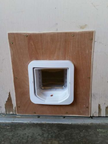 I’d just gone out at lunch and got the plywood, which was fortuitous, considering I expected the door to arrive next week. I’d planned to fancy up the “portal” and paint it to match the door (match-ish…door paint is oooooold), but considering we’d become reduced to putting two concrete blocks in front of the existing cat door to keep trash pandas out at night, I decided to go for it. Doesn’t need to be pretty, just needs to keep trash pandas out!
