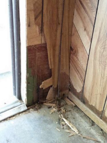 So…a raccoon did get into the garage. Somehow, it managed to get the door unlatched, and the hasp allowed just enough room for it (probably a kit) to get inside. He ate some cat food, but the problem occurred when he discovered he couldn’t get out. He certainly did try, and eventually succeeded, but not before he made one HELL of a mess. Tore up the (admittedly awful, but it is the garage) paneling.