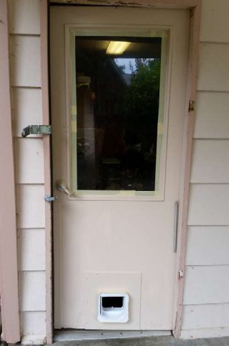 Since I did have the afternoon, I slapped one coat of paint over the door; it looked kind of trashy with the “portal” I had to make for the cat door, and then the repairs to the trash panda damage. I did tape around the window, which is more than the previous painter had done.