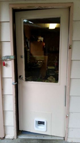 Doesn’t look too bad; I even cleaned the window. Not the prettiest thing I’ve ever seen, but the door is old and beat up, so I didn’t have a lot to work with in the first place. There’s still a spot at the bottom where I think I’ll put some reinforcement so they can’t tear up the door any more, but that’s a cosmetic thing, and my sole concern yesterday was keeping the trash pandas out of our garage.
