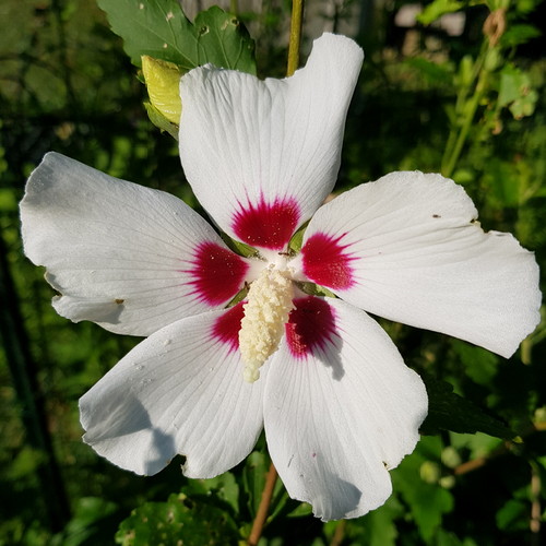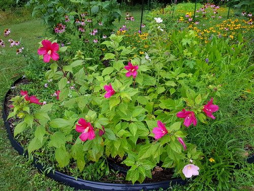 Native rosemallow, just as pretty as the named varieties! I have a lot more dark pink than the white/rose. Don’t care–love them both equally!