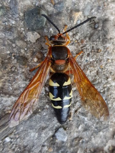 Big-ass cicada killer. I think it was stunned; maybe hit a car or something.