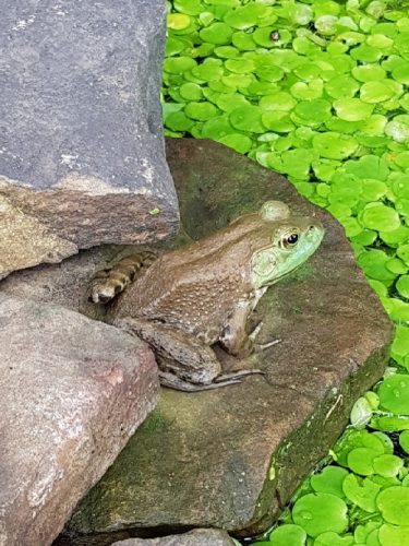 Our fat bullfrog male. He’s fearless; when I walk by the pond, most of the frogs squeak and dive, but this guy just sits and looks at me. He thinks the pond is his very own.