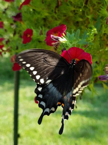 VERY flutter-y Spicebush friend on the calibrachoa. Next spring, I think I’ll get all calibrachoa for hanging pots; it’s very popular with butterflies, and (the red, at least) MLBs like it, too. I see more activity on it than I do on the Wave spatoonyas that I usually have. Dunno…we’ll see what I end up doing when spring comes.