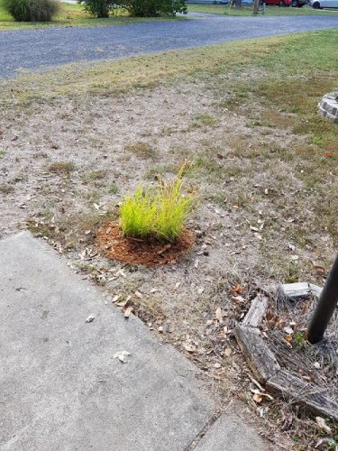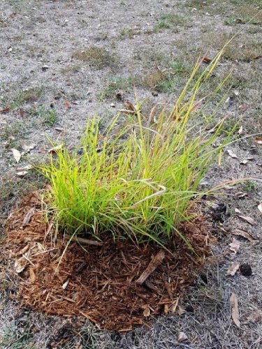 My accomplishments over the weekend were very few, but I did finally get the poor Sorghastrum grass out of its pots. I also discovered that the small pot I’d first thought was sea oats and later thought must be Indian grass is, in fact…sideoats. I have absolutely no idea how I managed to put sideoats in the pot; I thought I’d put all of the sideoats seed in Sara-Flah’s Giant No-Mow Flowerbed (where they did absolutely nothing), but apparently, I did not because sideoats bears its seeds…on the side of the seedhead! Speaking of distinctive seedheads, the stuff I planted from seeds that were sold as sea oats is something other than sea oats…looks like plain old wheat or something. I stuck it in the ground over by the pond, but don’t care whether it lives or dies. Not so for my poor remaining actual northern sea oats plant; that has one seedhead on it, and I want it to LIVE (and reproduce). Anyway, I put the two pots of Indian grass in the ground out front. I threw some water-absorbing polymer crystals in with the soil; apparently, this grass does well in dry areas, but our “dry” is beyond ridiculous.