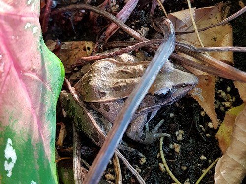 Again, while watering, I accidentally doused poor Cletus with chlorinated water. He didn’t seem fazed by it, but just in case, I quickly got a bottle of water and rinsed him off. He’s been singing off and on a bit lately; apparently Southern Leopard frogs sing in spring and in fall, but don’t have much to say in summer (leaving the stage open for Bully the Bullfrog, who has plenty to say!)