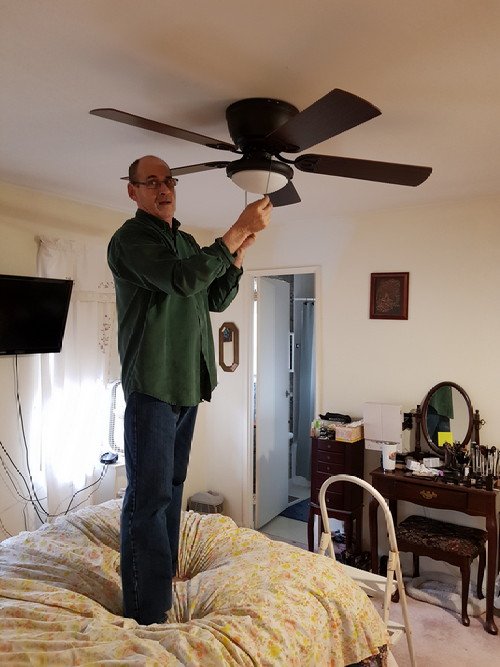 I gave up on the old ceiling fan, and bought a new one. It’s a 52″,technically too big for the room, but I want a lot of air moving when I’m sleeping, and this thing can do it! I did the unskilled labour, and P did the mounting and wiring. We got it installed in not too much time, and it works very well. We’re a good team!