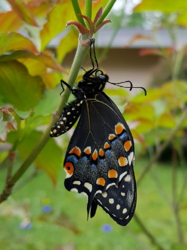 Actually, something did use the maiden grass, though not for food. I have no idea how I didn’t tear his wings because I was ripping at that grass, and he’d just eclosed, but he was undamaged. A beautiful male Black Swallowtail, and I don’t understand what he was doing in the grass out front when the nearest host plants are near the edge of the back yard. He must have made one hell of a trek to pupate! I put him on the dogwood so his wings could harden, but was still ripping up grass, so I don’t know when he flew away.