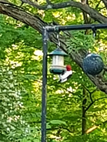 He actually turned up the day after the oreos left–I like to think he came to make us miss them less–but I didn’t want to do anything to startle him, so I didn’t take pictures at first. For the second time in my life, and the first time in about 10 years, I got to see a Red-headed Woodpecker! We named him Big Red, and this horrible photo is a testament to the fact that digital zoom on a camera phone is fucking worthless. No matter–he’s glorious, and he’s even brought his mate sometimes!