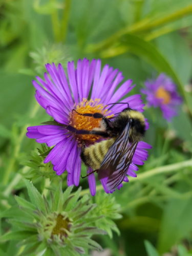 Bad lighting because it was getting dark, but a flash would’ve ruined it. Big fat bunglebee in an early-blooming aster (these ones were either not sheared, or were sheared only once).