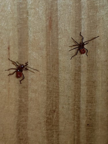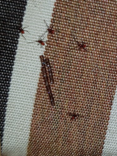 I was sitting in my rocking chair on Sunday when I felt a tickle on my arm. Thinking it was a fly, I swooshed it away, and (unfortunately) I killed the poor little guy. Had I known he was a newly hatched Leptoglossus, I wouldn’t have killed him. After a few more strolled onto me, I found the source; a strip of eggs on the side of my chair cushion. I moved all of the little dudes over onto plants, and although there appeared to be only 18 eggs, I’d swear there were 50 bugs, given the number of times I thought I was done, then discovered another one.