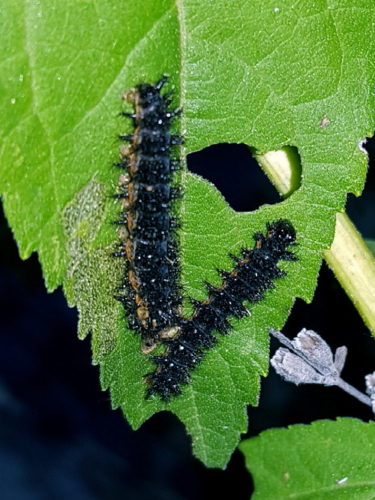 Again on Sunday, I happened to be walking by the front flowerbed after we’d finished mowing/trimming the yard. I’d been thinking that my Heliopsis and Rudbeckia out front were looking like shit, but it’s been dry, and I don’t water unless I have no other option (water bill is already high enough). Since it was getting dark, I got to see the real reason for the defoliation of my flowers…dozens of Silvery Checkerspot caterpillars. I know I have the butterflies, but they’ve never eaten the flowers out front before, so I didn’t suspect them. They aren’t out much in bright daylight, which is why I hadn’t seen them. I guess I can add these to my list, too, since that species is listed “special concern”, and indeed, believed to be extinct in the state of CT. I have Near Threatened red-headed woodpeckers and ornate box turtle babies (hopefully, at least), and a bunch of Special Concern caterpillars. Oh, well…I don’t care if the flowers look like shit; they’re for butterflies and bees anyway, not for people to look at. If my sole concern was what people see, I’d have a concrete yard that I’d just clean with a leaf blower once in a while and hose down once every few years.