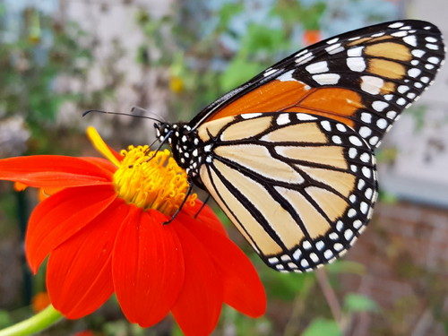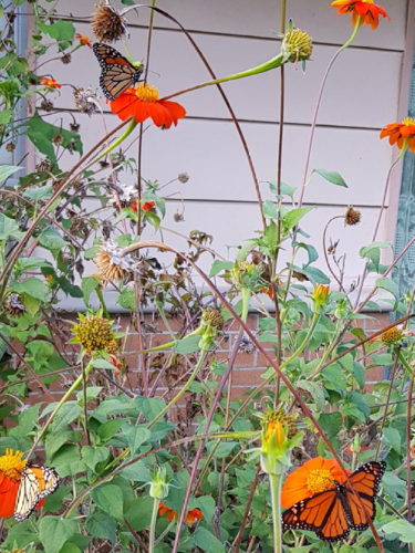 I may not have had many caterpillars this year, but there must have been some that I didn’t see because I certainly have several very fresh Monarchs! Two boys and a girl in one shot. The Mexican sunflowers look like shit, but the flutter-guys care not in the least.