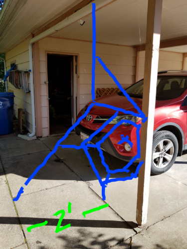 This orb weaver started out with a small web up near the gutter of the carport. His (or her…I don’t know) next web was larger, and encompassed one entire corner. The third web is the one that earned him the name “Empire” because he’s building one. The web sort of got messed up yesterday, either due to wind damage, or to cats’ tails, but somehow I doubt Empire will be daunted by a small loss. Terrible drawing (I’m not thrilled with the plastic screen cover on my phone case because my stylus skips), but good enough to illustrate the sheer size.