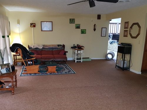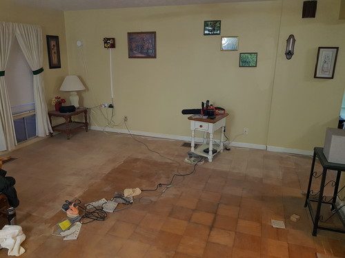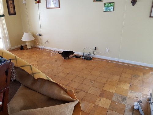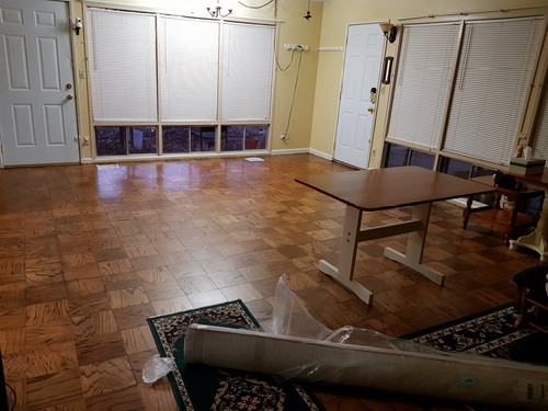 Originally, I’d intended to do half the room at a time, but I decided, “fuck it–go big or stay home”. P wasn’t too happy about it; he didn’t mind the look of the carpet, and he thinks hard floors are too cold. He doesn’t have to clean, though, and he had told me he didn’t care what I did, so there’s that. As of Sunday, 02-25-19, there is still carpet in the hallway, but that’s going away before I finish this project. I told him I’d get runner rugs; at least those can be taken outside and actually cleaned properly.